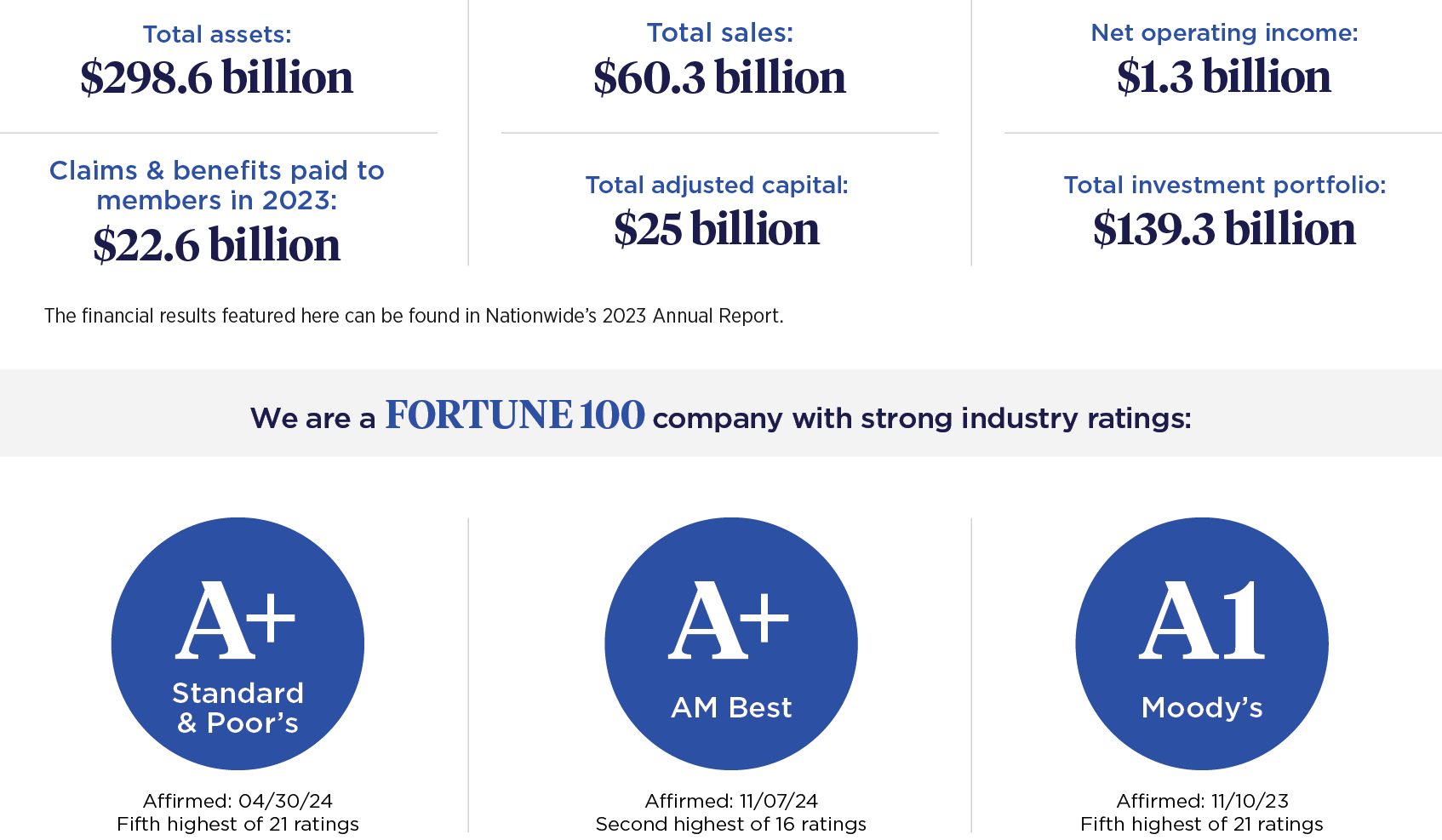 An A+ designation is the third-highest level in S&P’s 21-category scale, indicating robust financial resilience, sound risk management practices, and a solid market position. The rating takes into account Nationwide’s diversified product portfolio, stable operating performance, and strong capitalization.